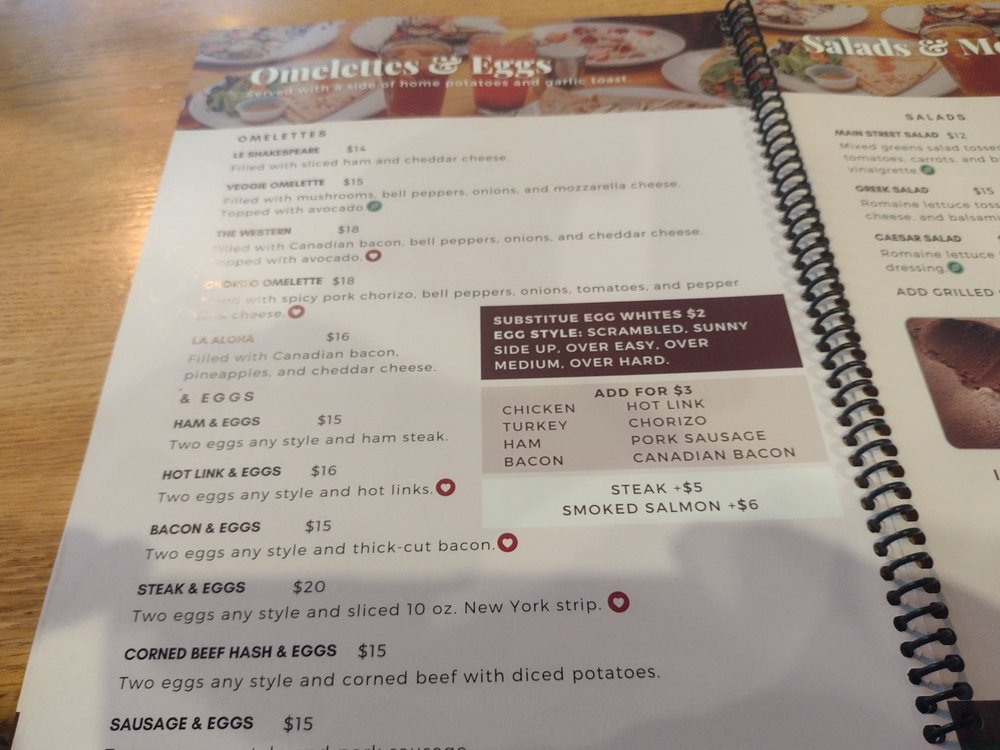 Filled with Canadian bacon, bell peppers, onions, and cheddar cheese. Topped with avocado. Served with a side of home potatoes and garlic-buttered toast.