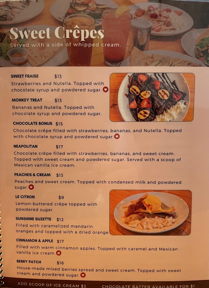 Chocolate Crêpe filled with strawberries, bananas, and sweet cream. Topped with sweet cream and powdered sugar. Served with a side of whipped cream and scoop of Mexican vanilla ice cream.